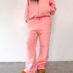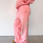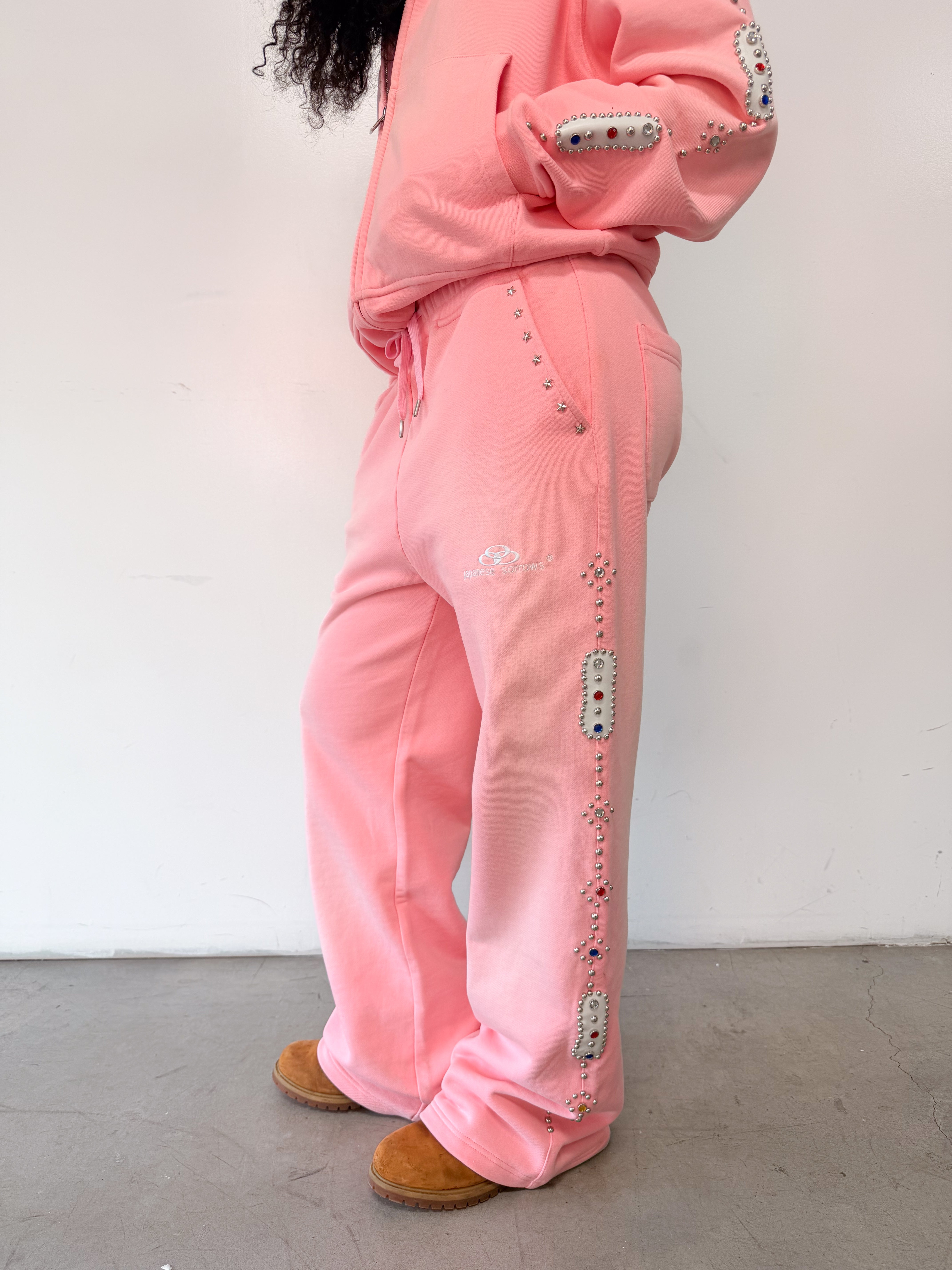 Baggy, straight-cut pants made from heavyweight 450 GSM (12 oz.) French-terry fabric. Elastic waistband with adjustable drawstring. Front pockets detailed with custom star pendants. Jewel-like studs and decorative patches run along the side seams. Two front pockets with a relaxed, structured fit.