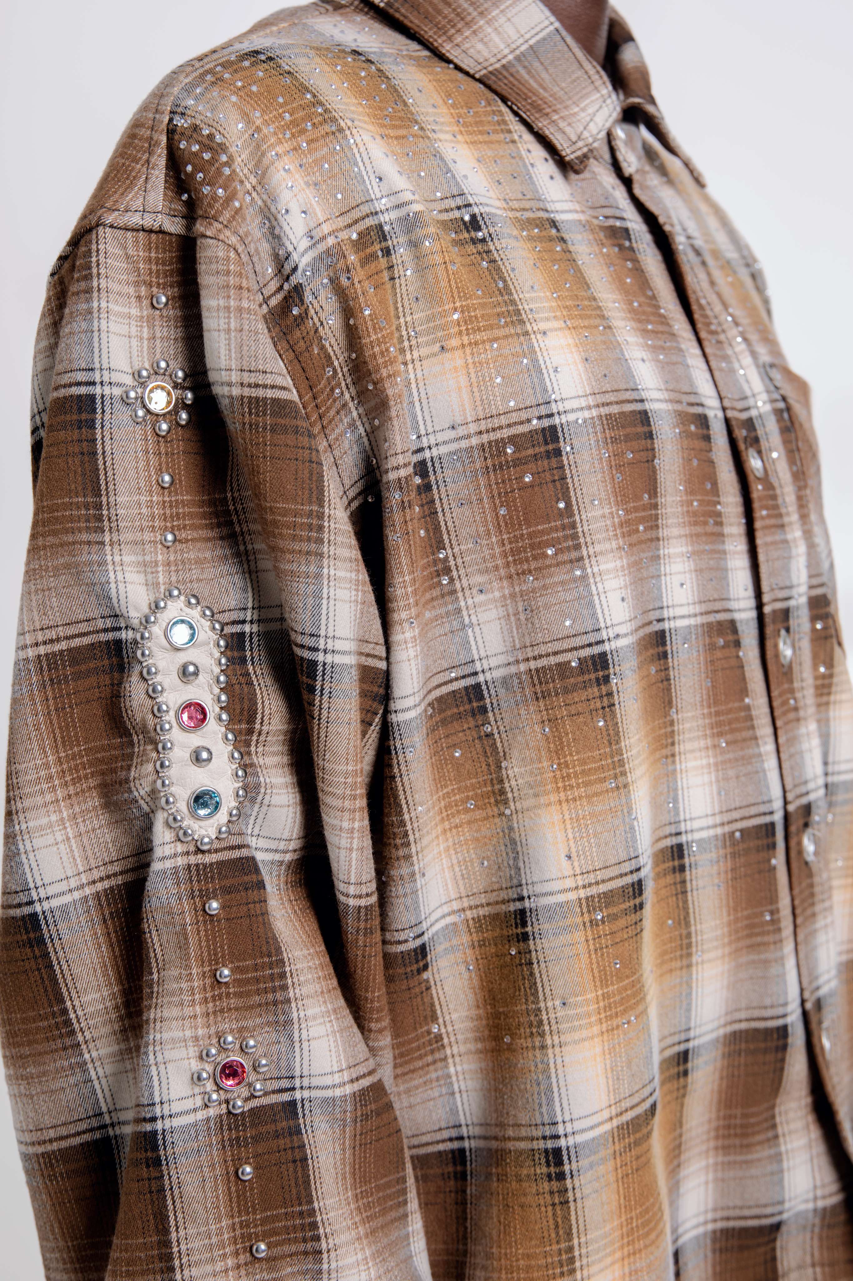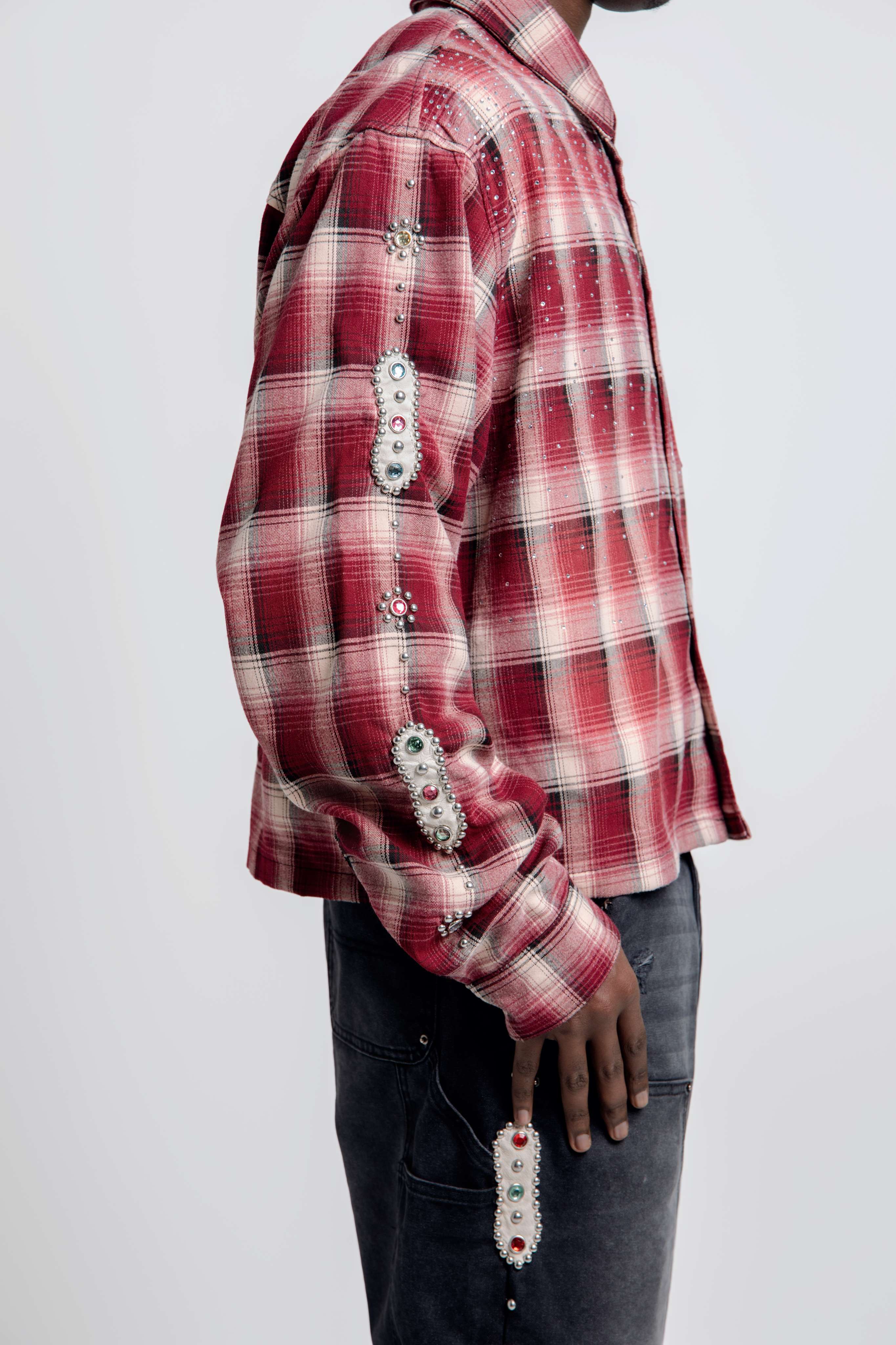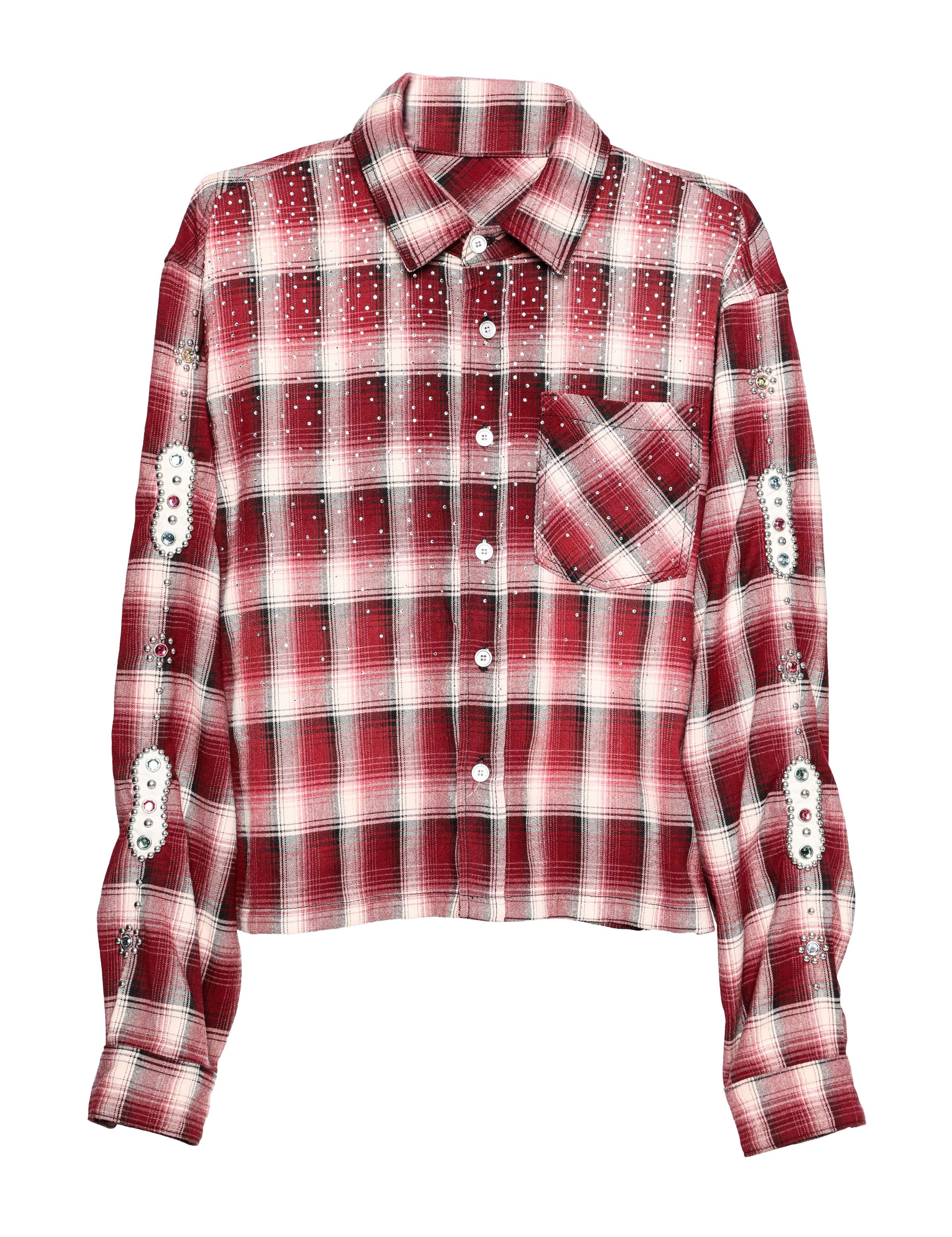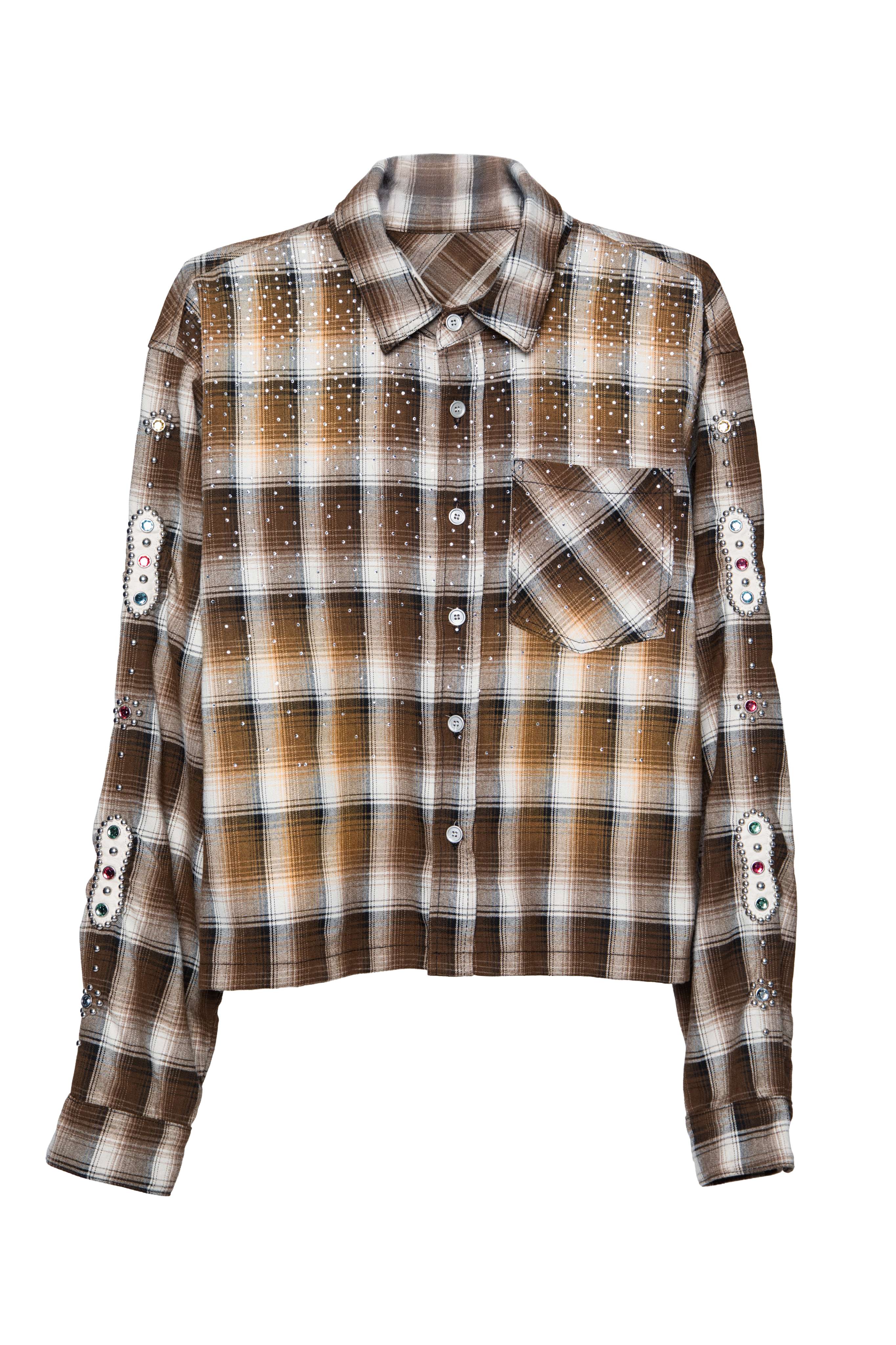 Embellished Cropped Flannel Shirt in soft cotton plaid with gradient rhinestone dusting and sleeve multicolor gem appliqué patches.