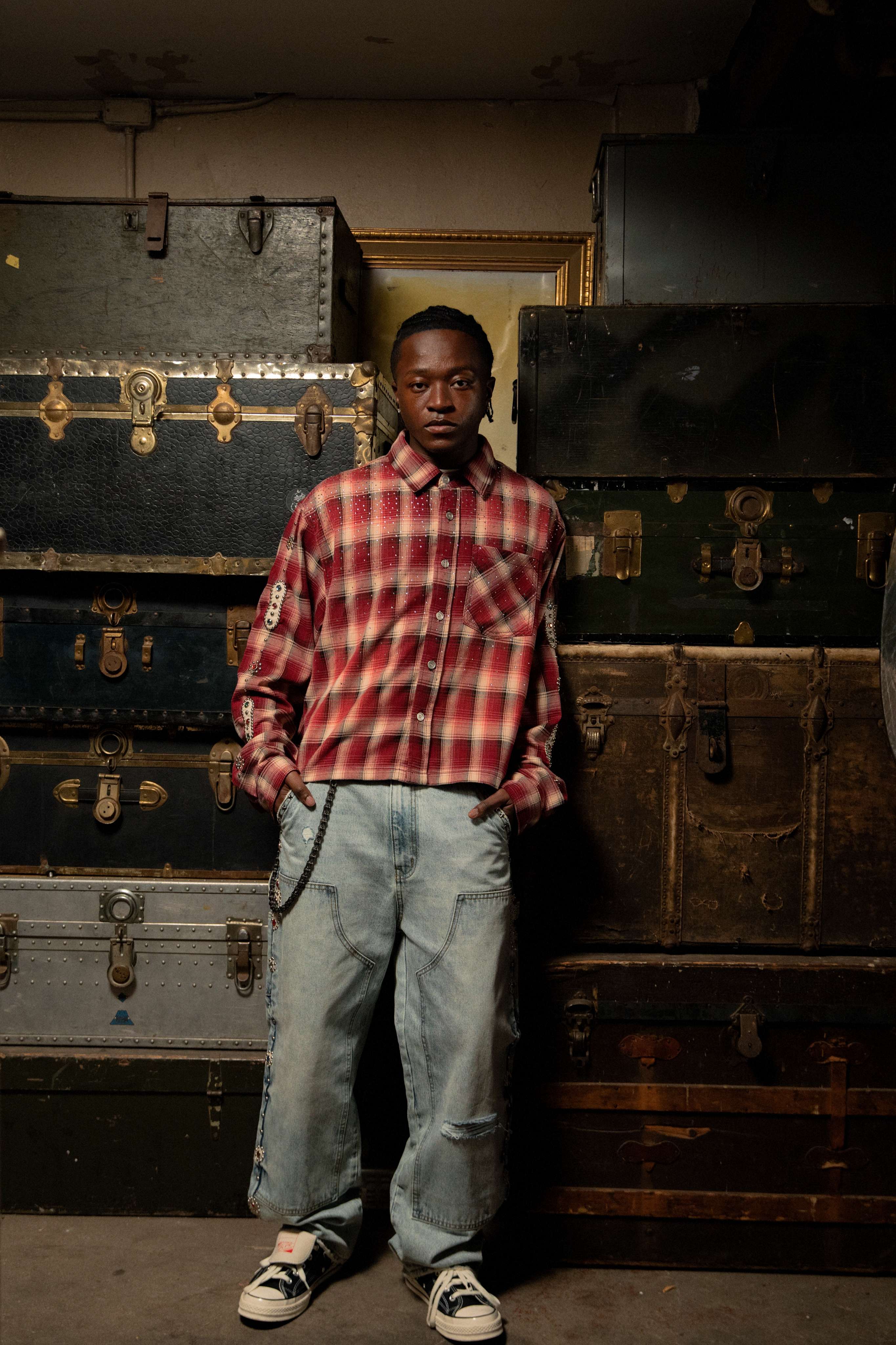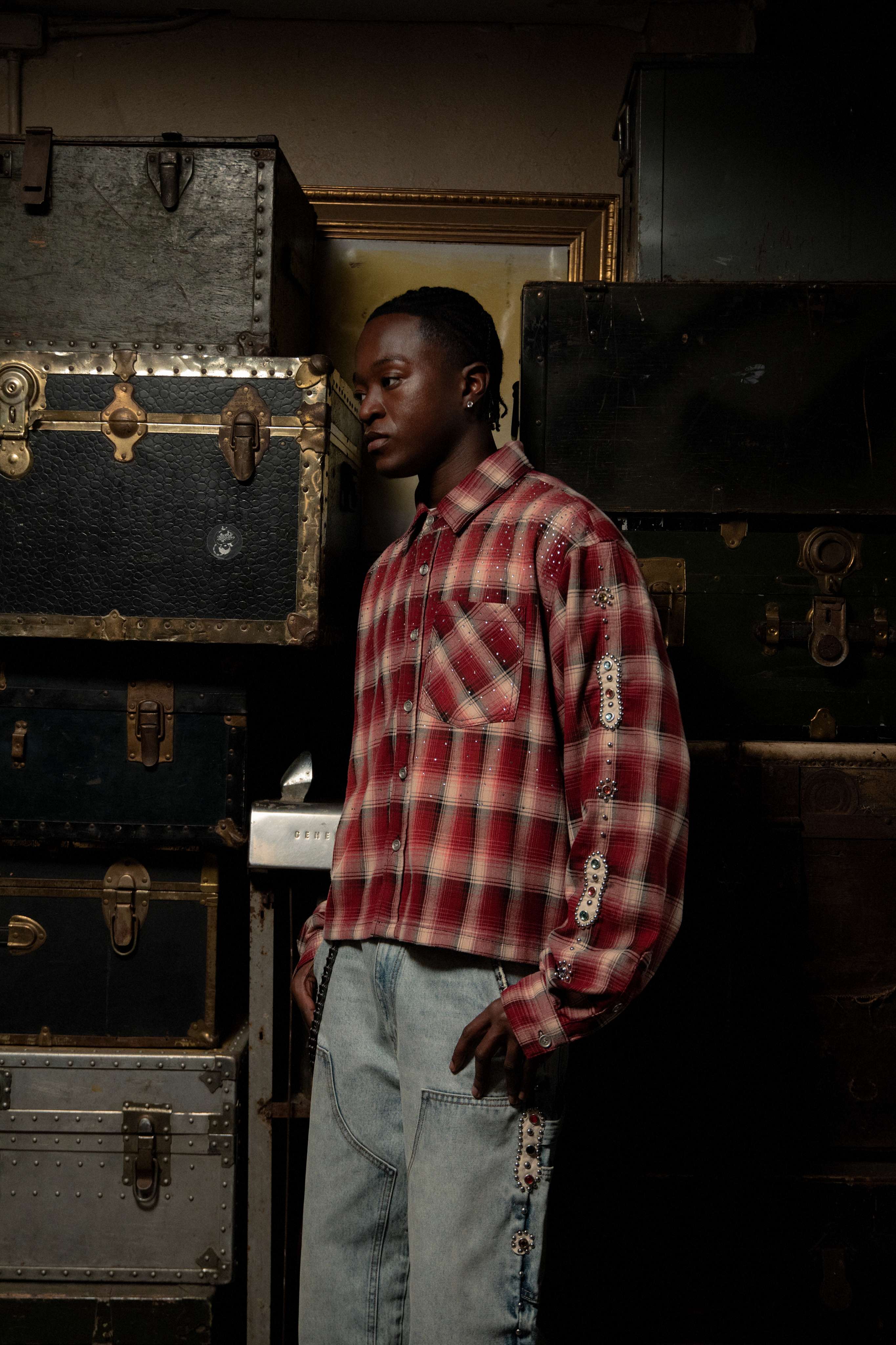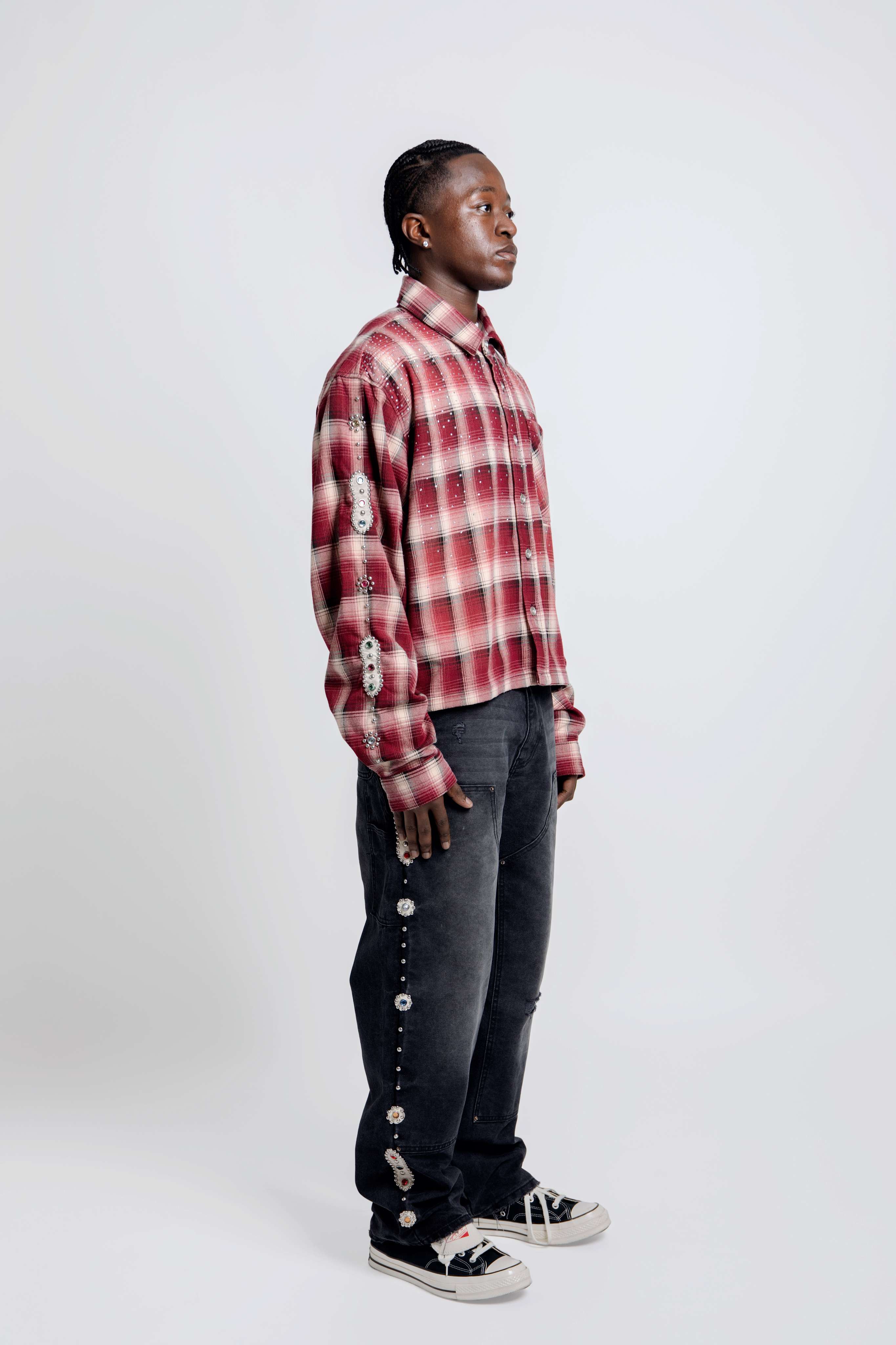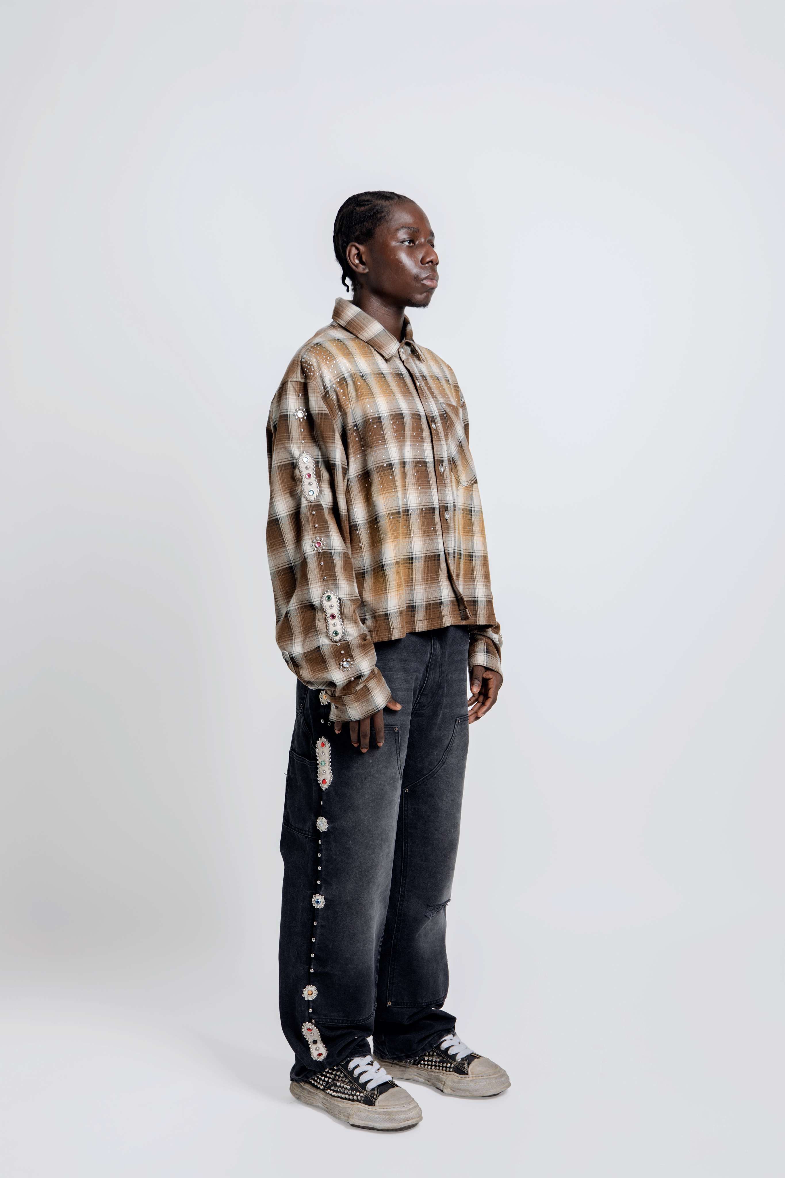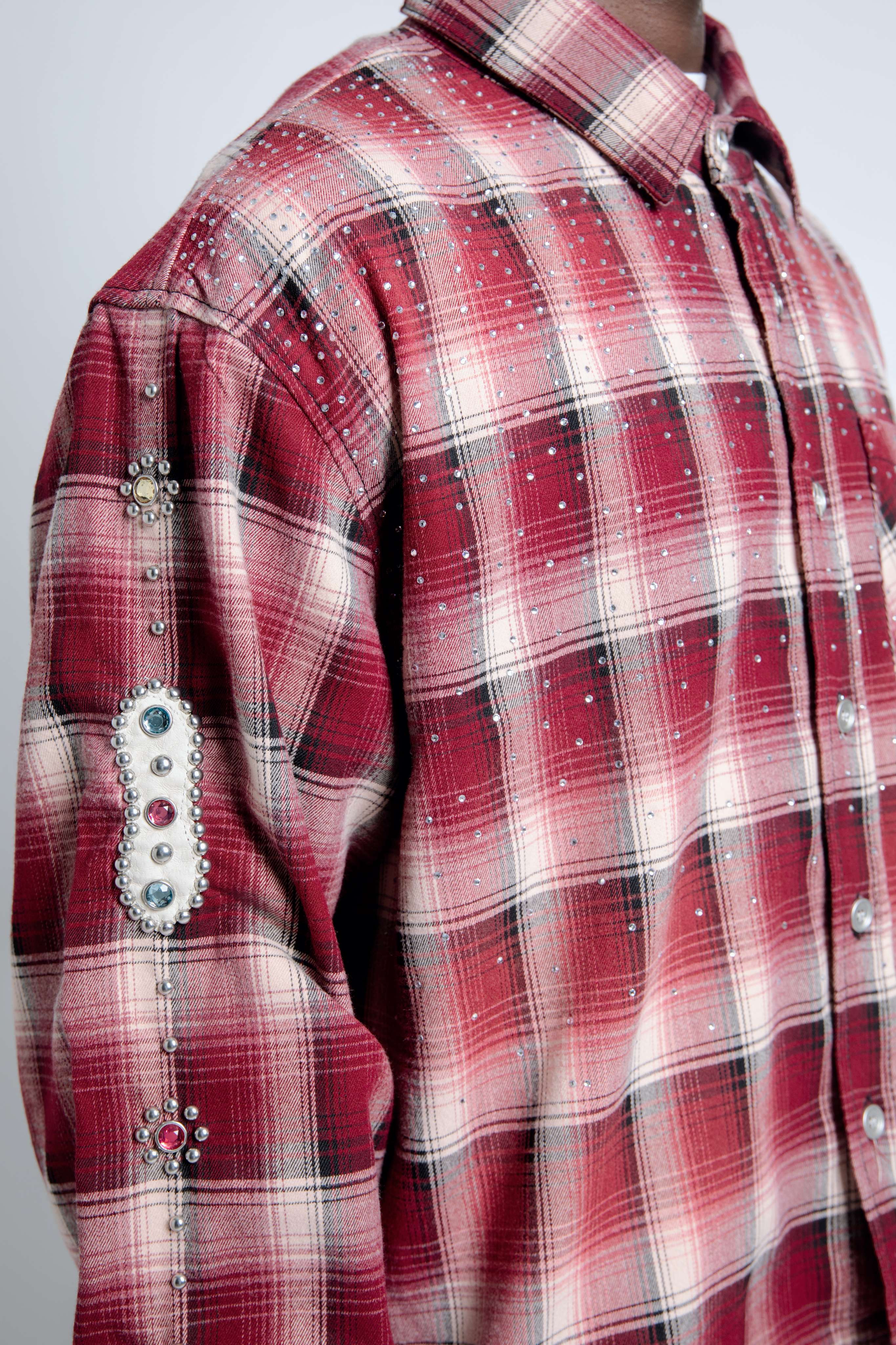 Embellished Cropped Flannel Shirt in soft cotton plaid with gradient rhinestone dusting and sleeve multicolor gem appliqué patches.