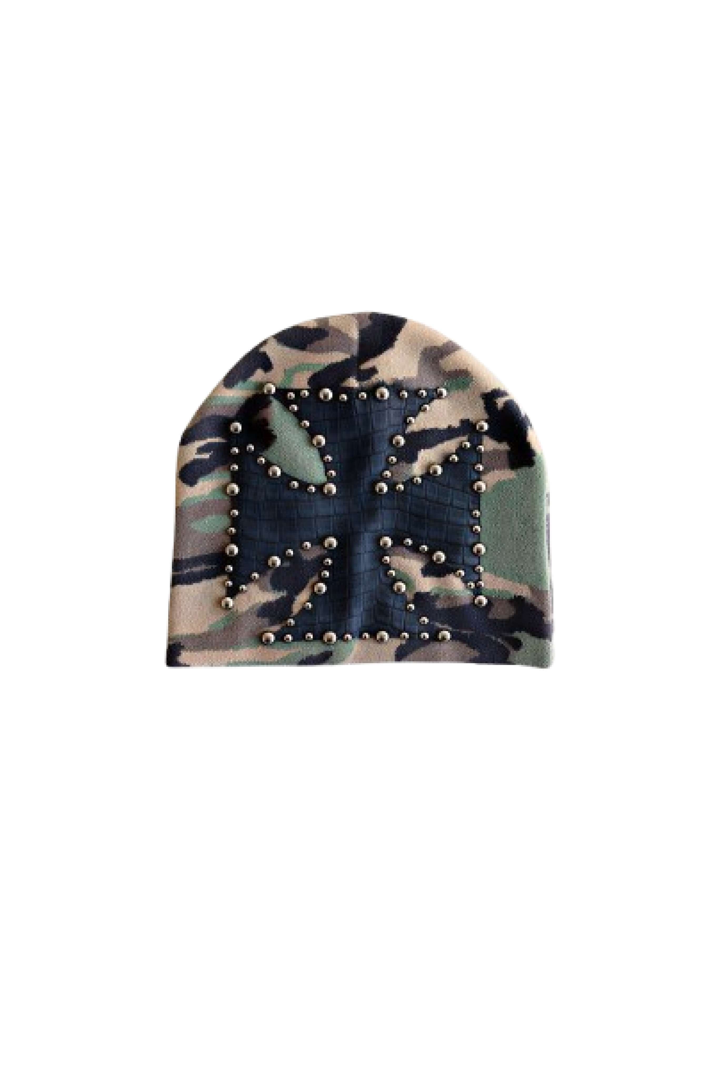 Hysteria Beanie in soft black knit with a crocodile embossed cross panel framed in metal rivets. The embellishment sits flat but dimensional, so the beanie still hugs your head cleanly while the front reads like armor.